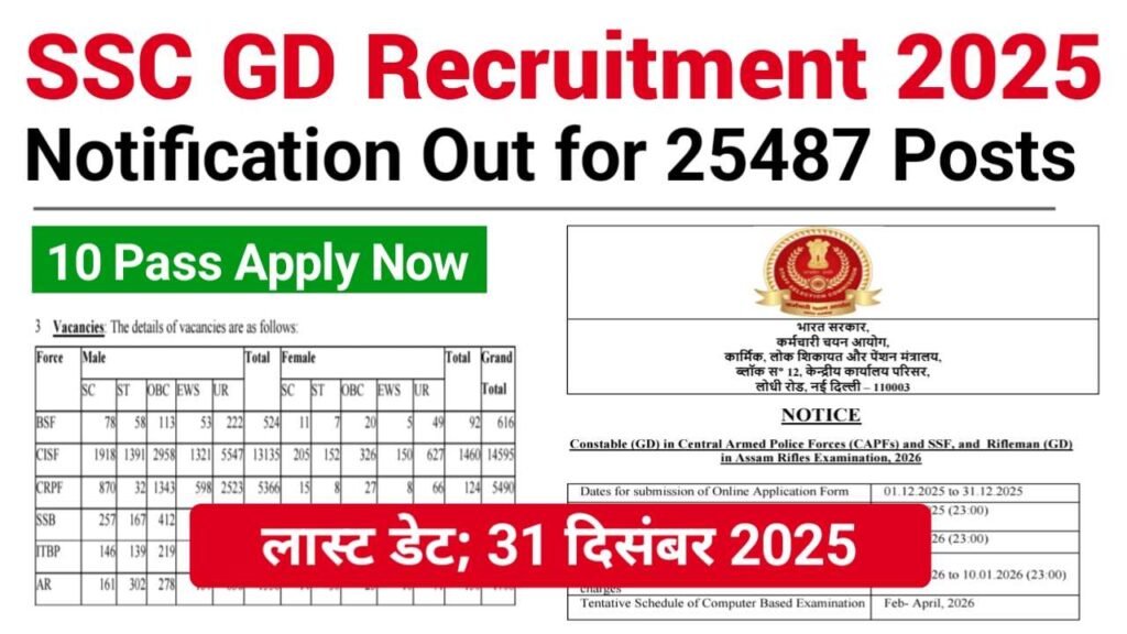 SSC GD Recruitment 2025: SSC GD Constable 2026 notification has officially been released. Staff Selection Commission (SSC) has announced a major recruitment drive for 25487 General Duty (GD) Constable posts in forces like BSF, CISF, CRPF, SSB, ITBP, SSF and Assam Rifles. This year, number of vacancies is higher compared to the previous year, making it a golden opportunity for lakhs of youth preparing for government jobs in the paramilitary forces. The online application process for SSC GD 2026 has already started from 1st December 2025. Interested and eligible candidates can submit their applications last date application is 31st December